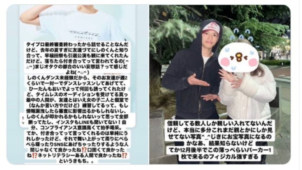 ひーたんさんは「篠塚大輝さんにタイプロの最終審査に落ちたら付き合ってほしいと言われている」と投稿しています。